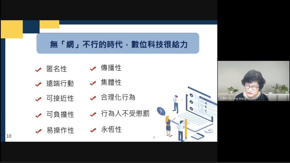 王教授強調,在「無網不行」的時代,舉例了心理學家Suler提到「網路去抑制效應」,此效應分成正向與負向。正向來說會是把原本不敢說的說出口,進行更多的倡議與正義表現,然而負向的話,則可能會有匿名性、隱形、異步性(加害者可以迴避被害者的反應)、固相注入(因缺乏現實互動要素,所以以自我想像與期待創造出對方的特性)、分離的想像(因為只是個遊戲,所以沒有真實性,可以淪於幻想)和弱化位置與權威(因為降低對權威、身份、權力的界線,變得我們都一樣的想像,所以什麼都敢說、都敢做),使加害行為更容易發生且成本更低,受害風險因此加劇。由此可見,不再是網路歸網路、實體歸實體,網路是實體社會的延伸,但行為的風險更小。
