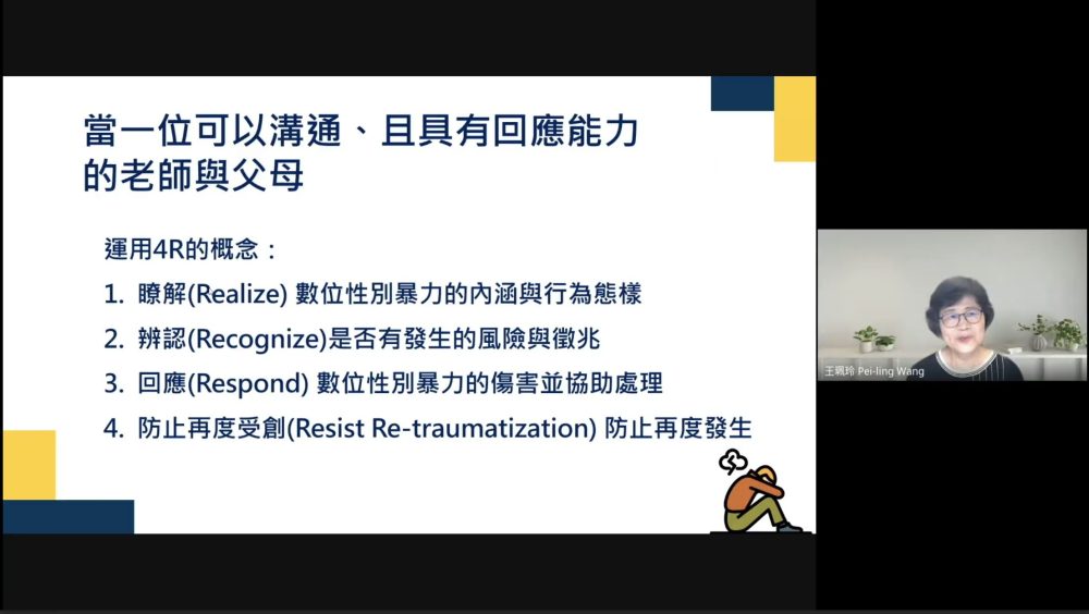 - 當回應力的教育者與父母:理解、辨認、回應與防止再度受創(4R原則)。