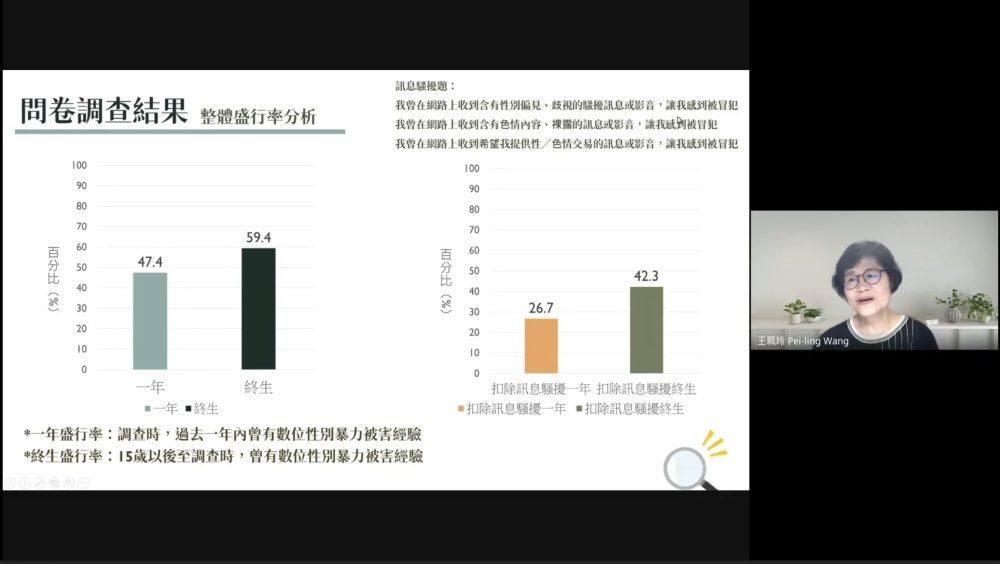 - 網路性騷擾(如要求裸照、傳送色情訊息),一年盛行率 40.3%,終生(15歲以上到填問卷當下的年齡)達 48.5%。