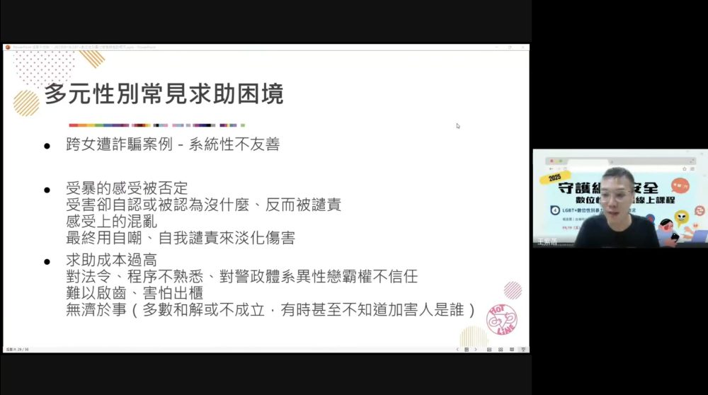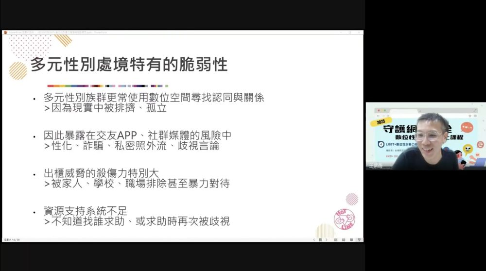 講師楊掁賢總結了數位性別暴力中多元性別族群比例偏高的可能原因為: