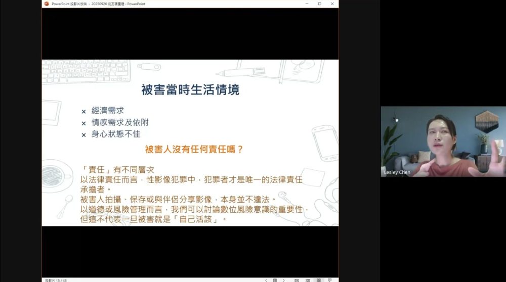 本次主講者陳禹先為社會工作師,所接觸到的個案多為詐欺或性影像等數位暴力被害人,因此希望大家先思考「在數位暴力特別是性影像犯罪中,被害人有責任嗎?」以法律層次來說,被害人拍攝、保存或與伴侶分享影像,這一行為並不違法,但是該影像如果未經「當事人即被害人」同意就被散布、重製、傳輸或公開陳列,則觸犯了《刑法》妨害性隱私罪章。 因此,在數位性別暴力中,陳禹先社工認為從道德或風險管理而言,我們可以討論數位風險意識的重要性,但絕不代表被害就是自己活該。