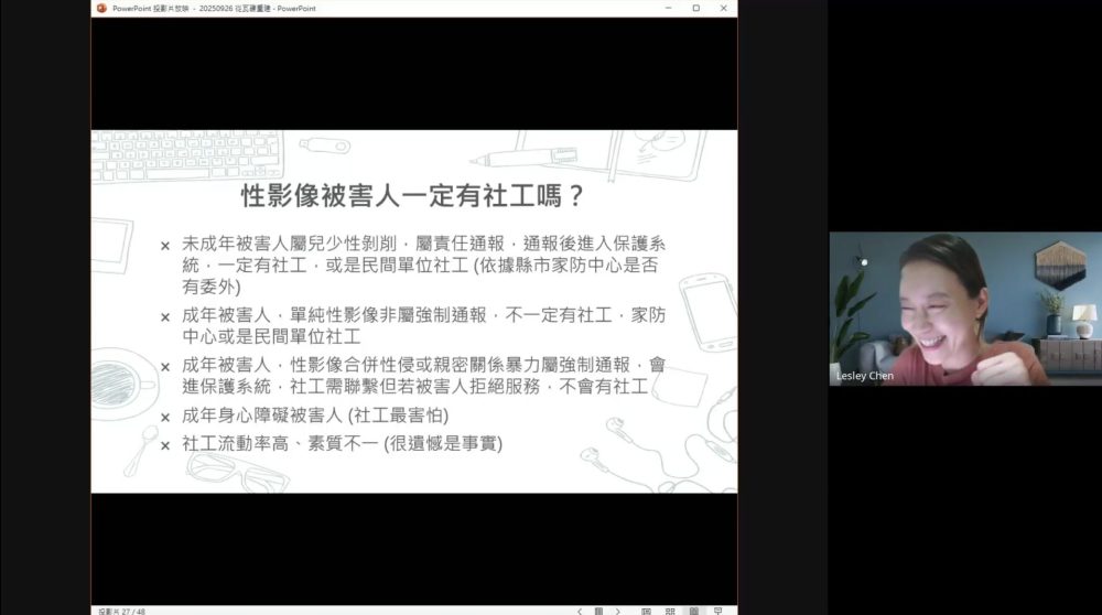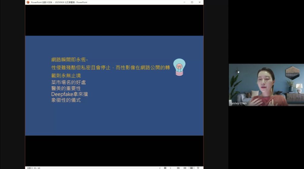 在課程的最後時間,與會者均積極提出問題及參與討論,重點多放在如何教導不知道自己正在犯罪中的孩童、能透過哪些面向提醒未成年學生安全使用網路、如何向學童宣導網路交友之性影像的議題等,希冀能引導學生與孩童拒絕兒少性剝削與數位性別暴力的發生,建立正確的自我保護觀念及熟知相關求助管道。