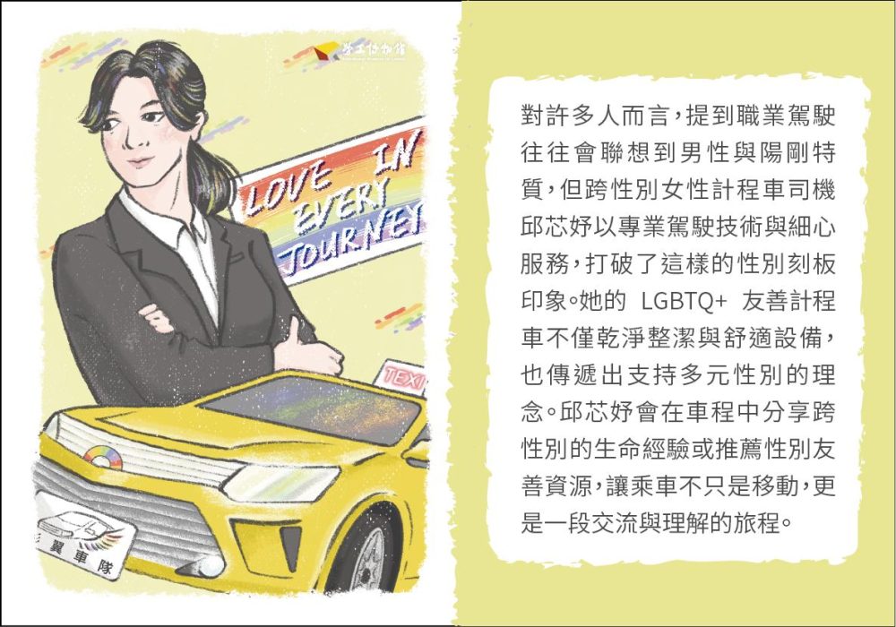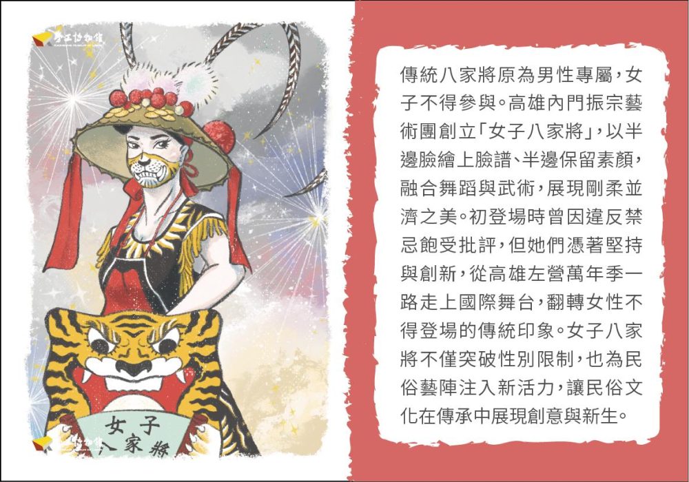 2025 年推出的「性別與勞動圖卡 2.0」,更進一步結合高雄在地特色與多元族群文化,除了呈現不同職業的性別多元之外,也思考傳統文化創新與延續的可能。本次共收錄 10 種職業,包括女主廚/總鋪師、花藝師、消防員、半臉家將、變裝皇后(Drag Queen)、賽車手、女性引水人、男性織者、瑜伽老師與跨性別計程車司機。其中,總鋪師與八家將取材自高雄內門的辦桌與藝陣文化,跨性別計程車司機則來自高雄街頭的真實勞動現場,讓性別不再只是抽象概念,而是貼近我們港都日常!